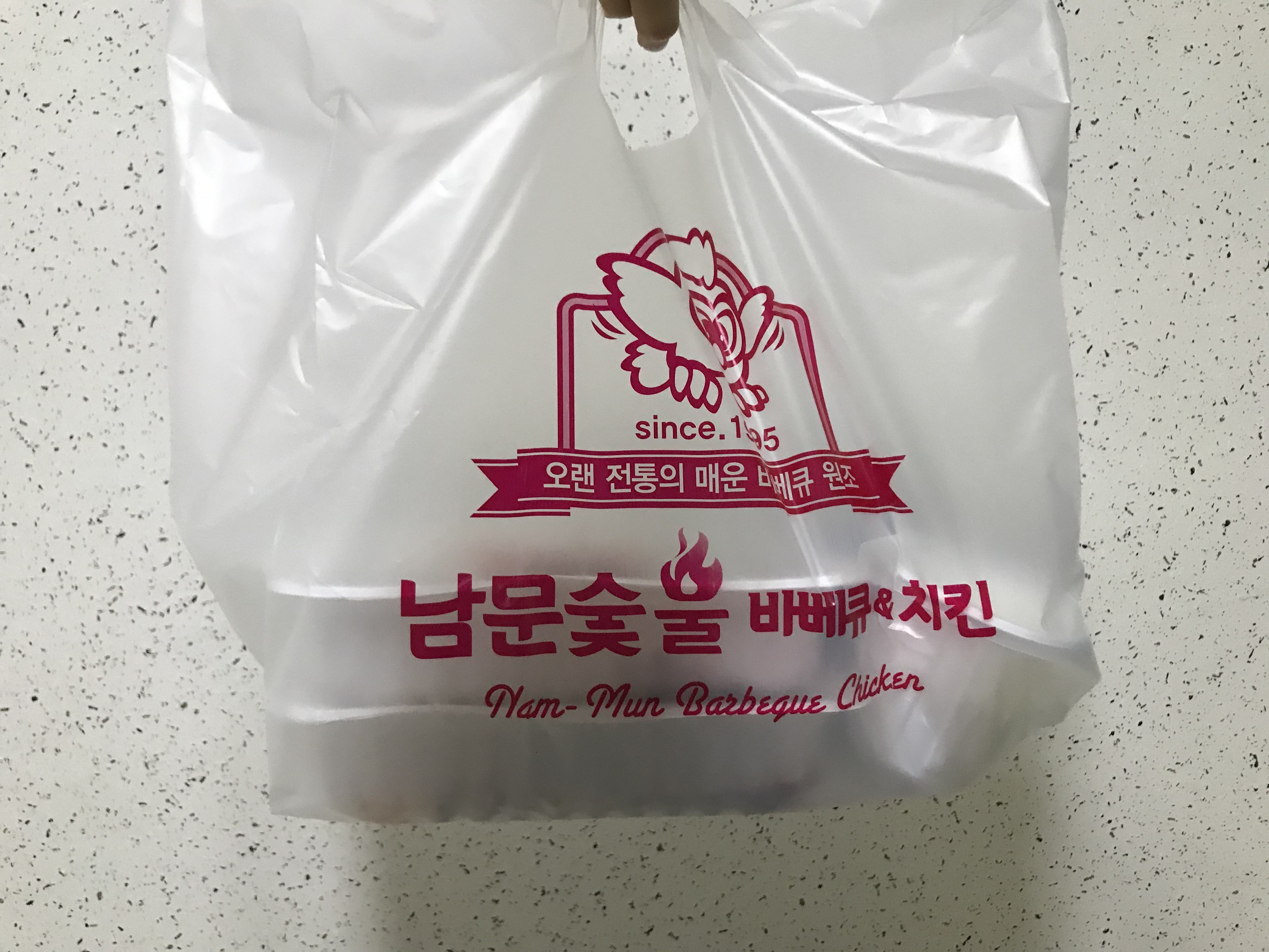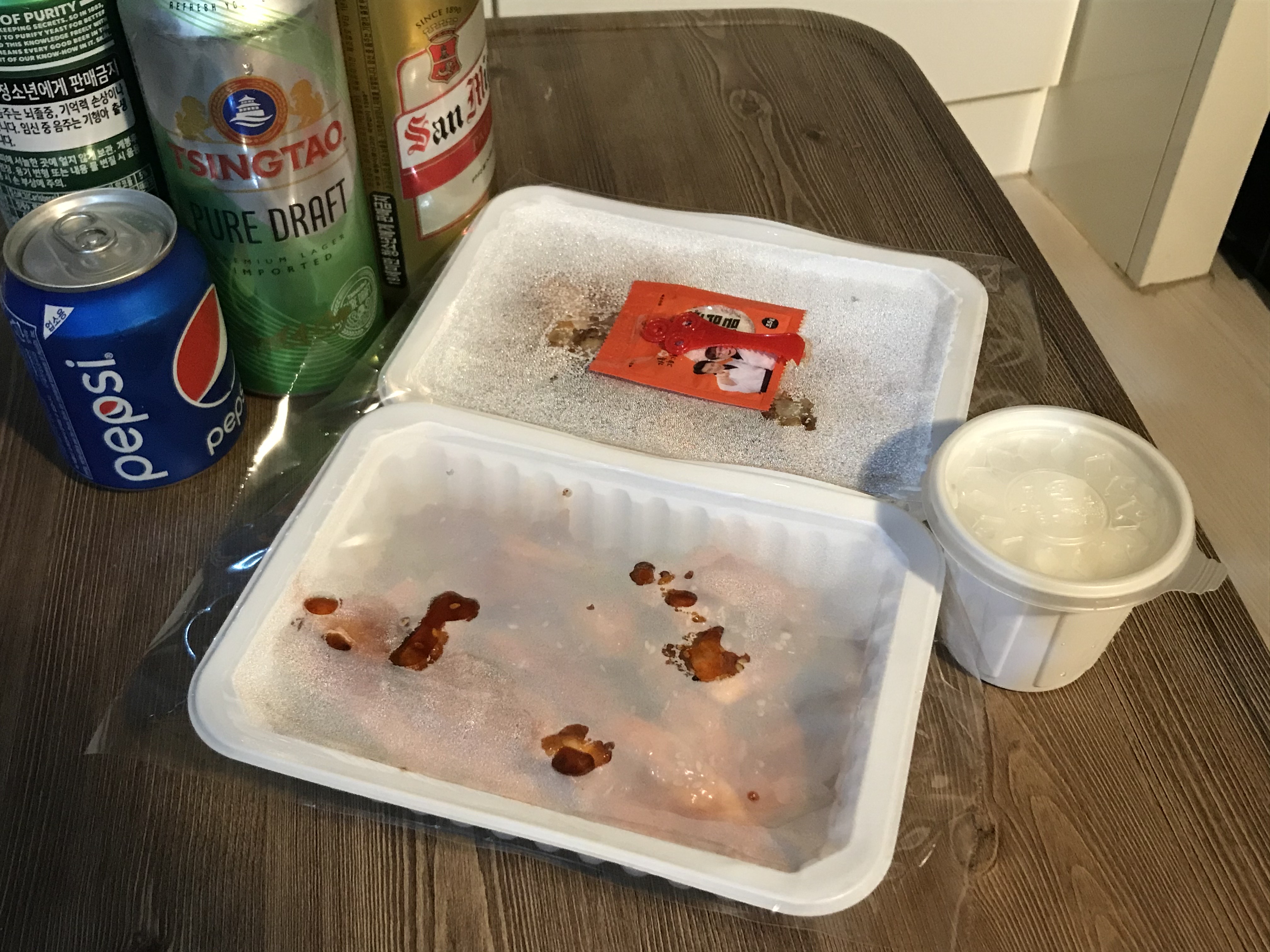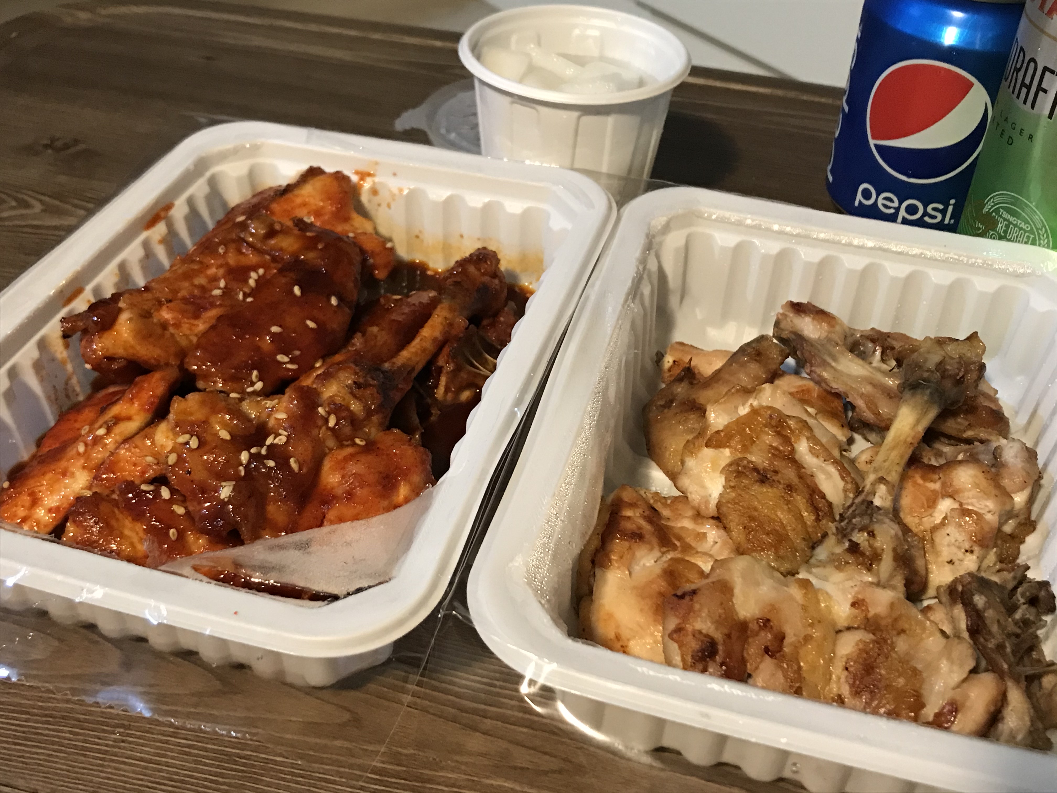 편의점에서 맥주와 매운맛과 보통맛 반반 구운통닭을