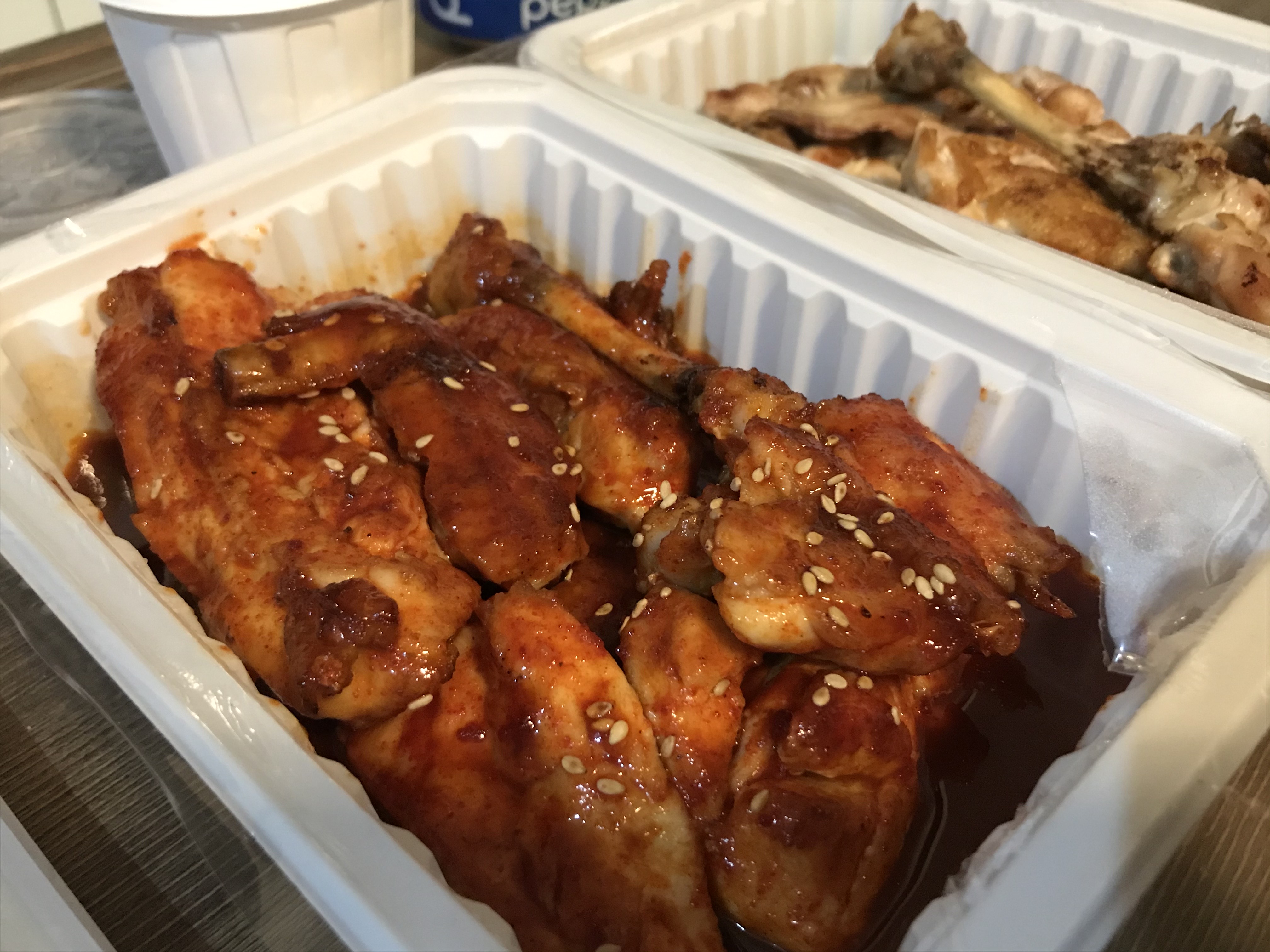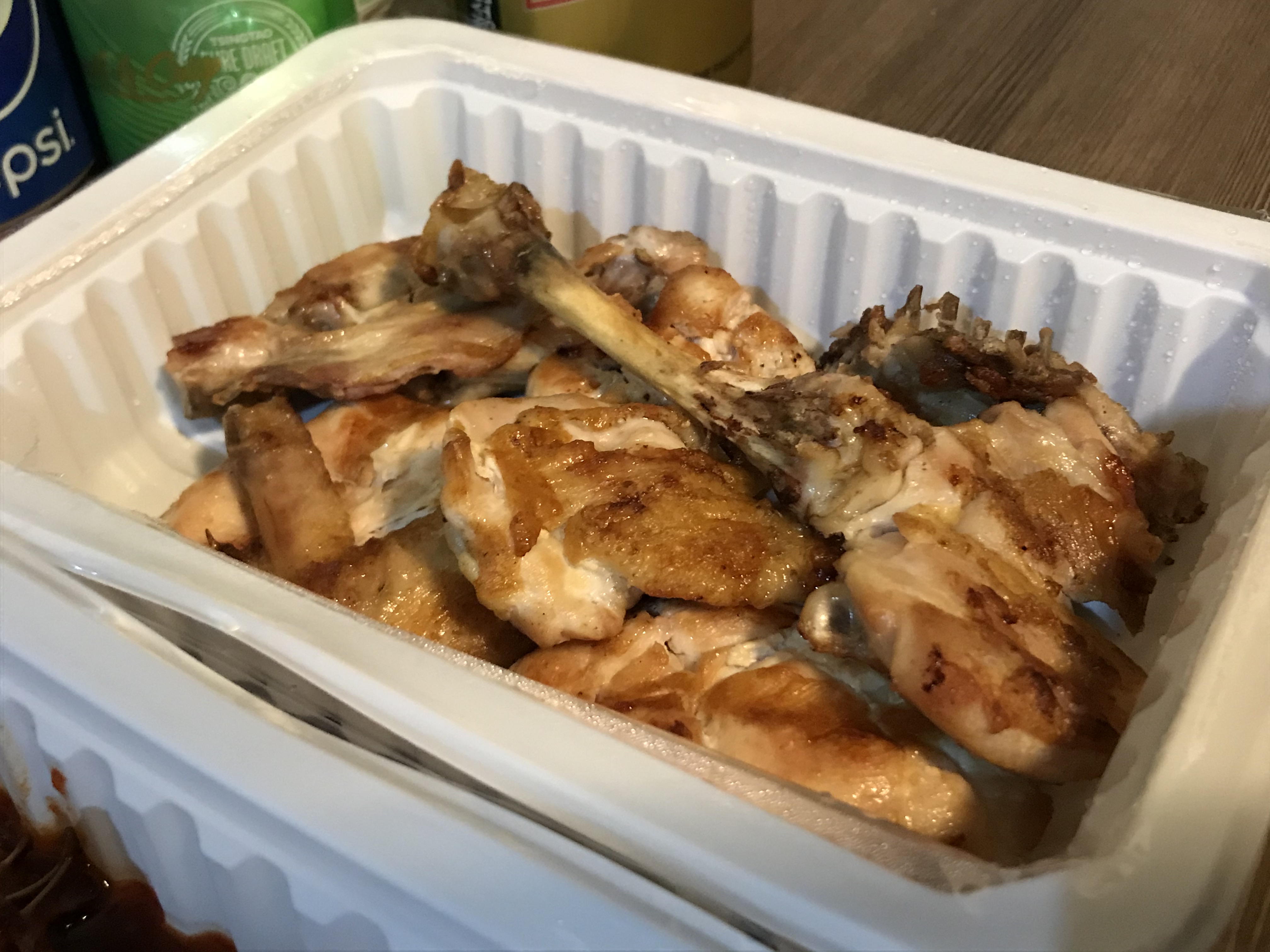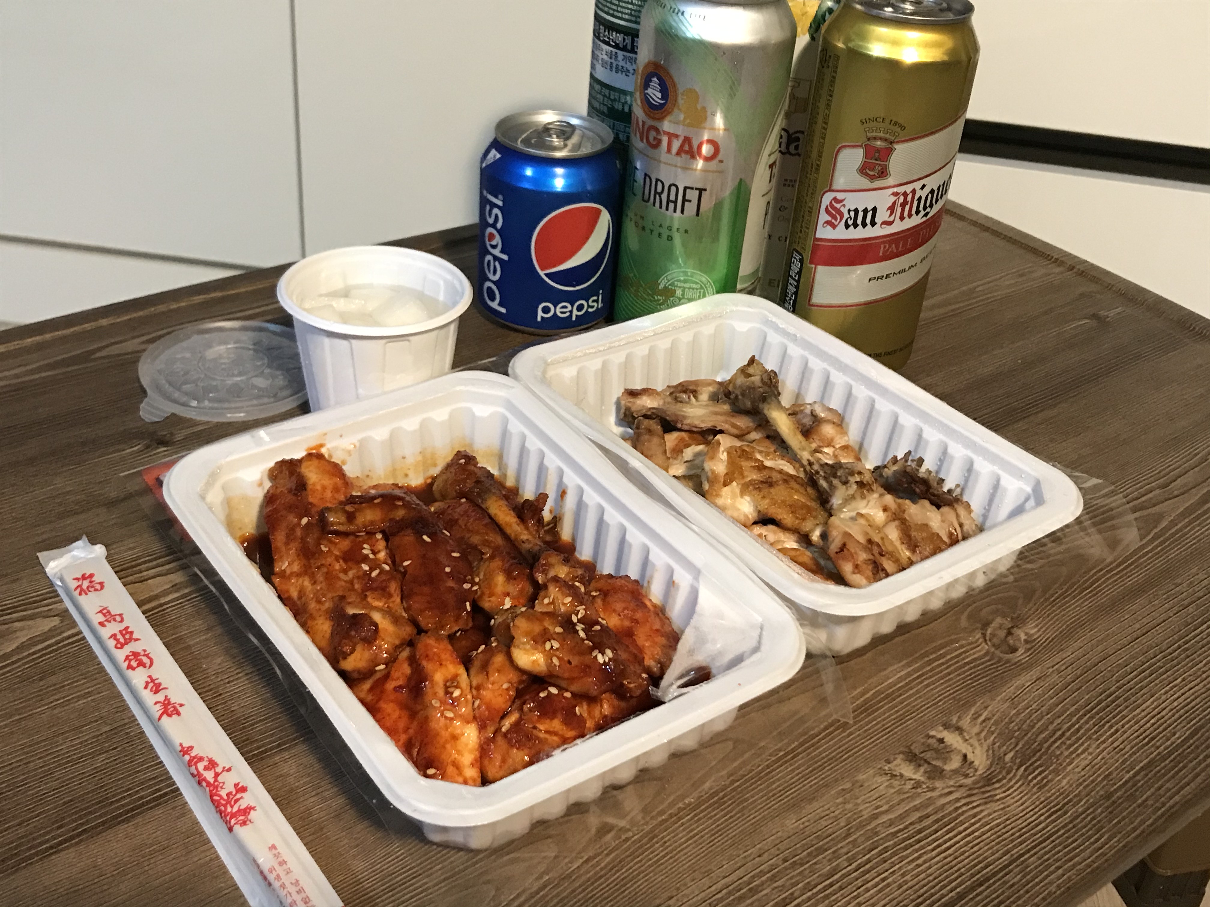 편의점에서 맥주와 매운맛과 보통맛 반반 구운통닭을