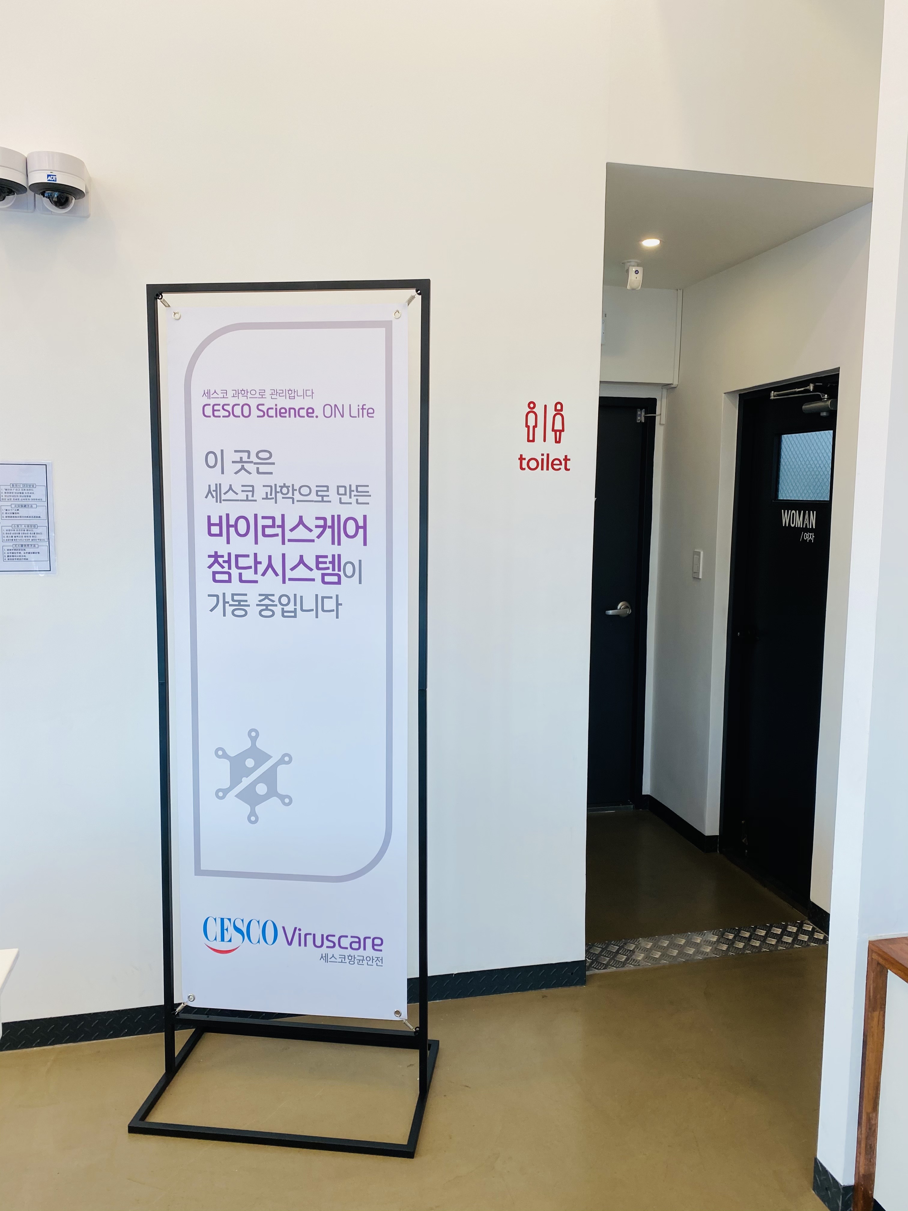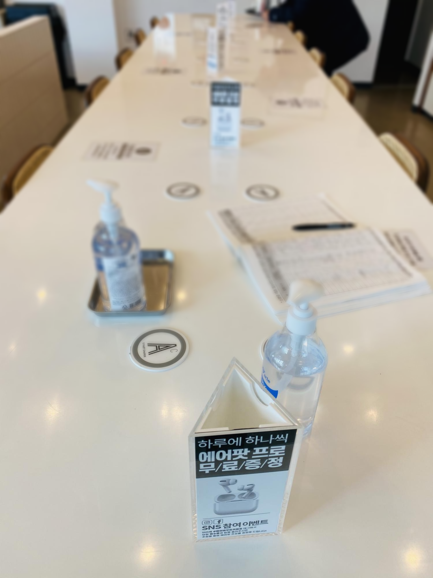 손세정제, 출입명부 등이 배치되어 있었어요!