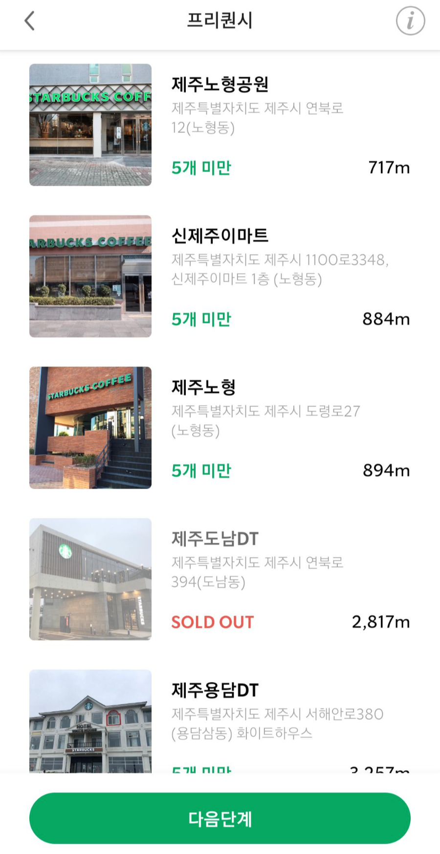 제주의 다양한 스타벅스 매장을 리스트에서 볼 수 있었어요.