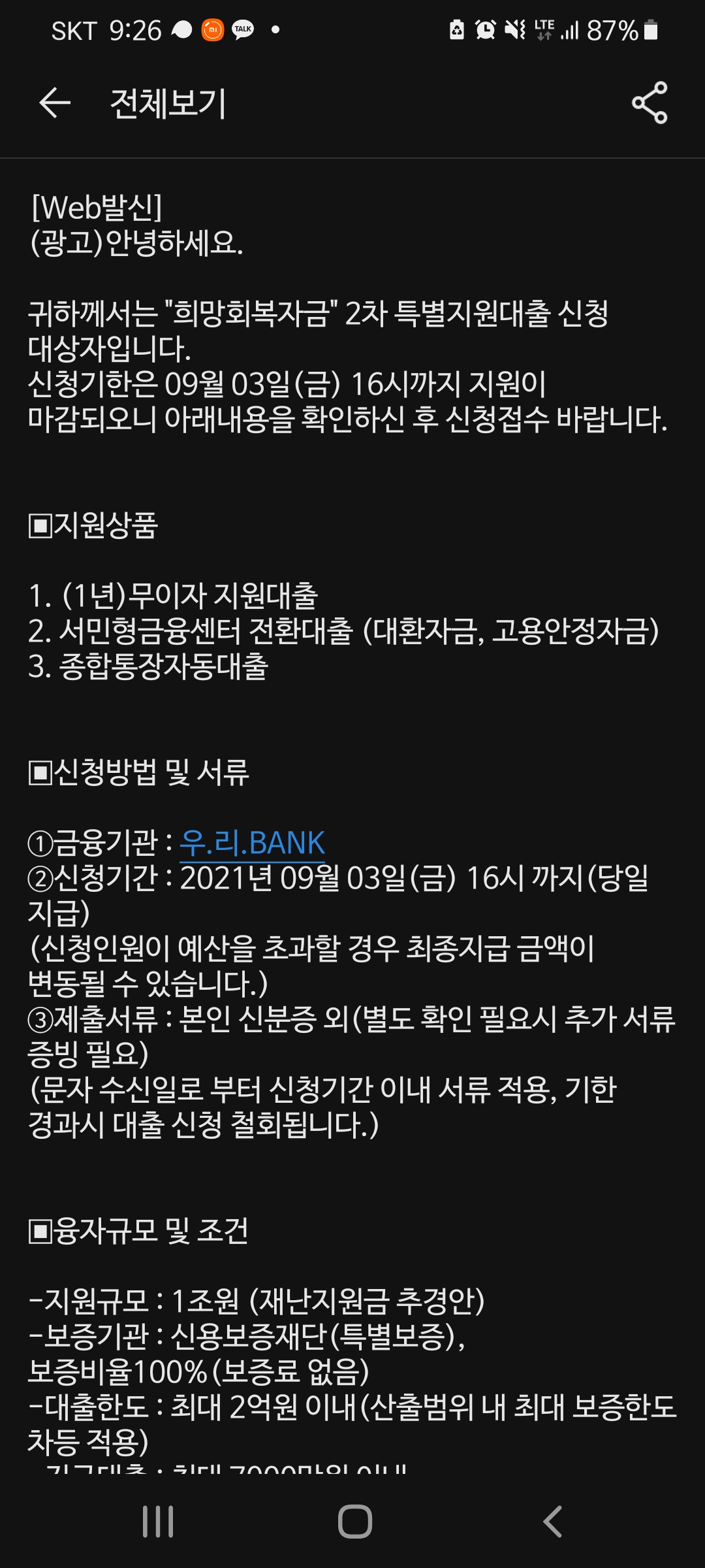 지원금사칭 문자주의 우리은행 대책안전자금 안녕하세요! 리뷰럴입니다 오늘도 안오면 섭할 뻔 했습니다 각종 은행 대출과 지원금을 빙자하며 어려운 시국간 사람들을 현혹시키는 스팸문자에