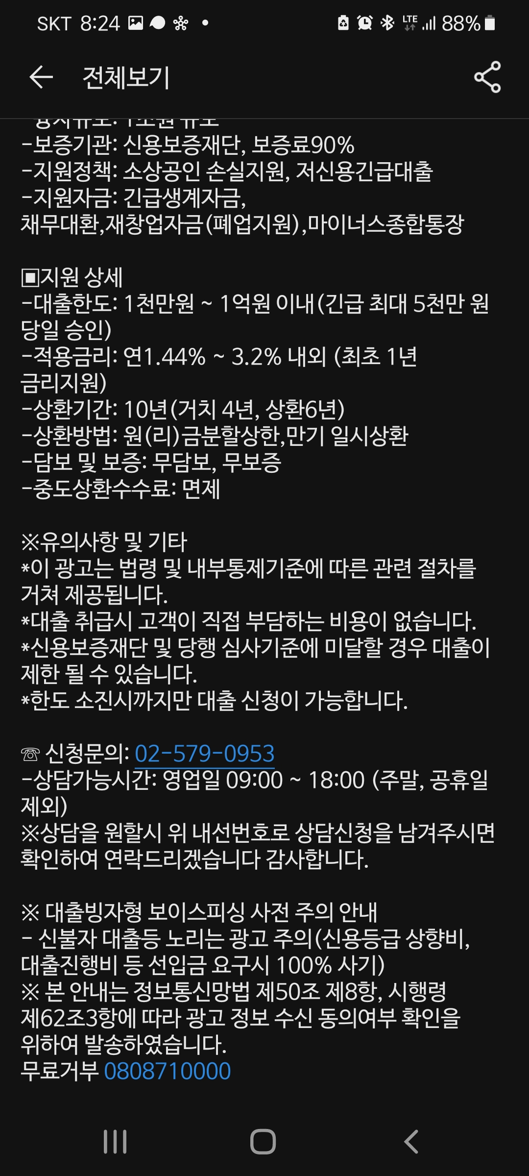 이번 문자의 경우에는 급했던 건지, 당행이라고 표기한 본래 대상이 되는 은행의 이름도 없더라구요. 또한 대출 조건이 말도 안되게 관대하거나 좋다면 우선 의심해보시는 것이 좋습니다.