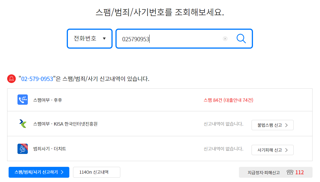 우선 문자에 제시된 내용들로 의심이 조금이라도 생겼다면, 번호조회 사이트를 통해 조회를 해보는 습관이 정말 중요한데요. 저는 의심이 생기면 'KT114'등의 번호조회 사이트를 통해 조회해보는 습관이 있습니다. 문자에 안내된 상담번호인 02-579-0953을 조회해보니 후후에서 대출안내 스팸으로 84건이나 신고된 번호라고 조회가 되네요.