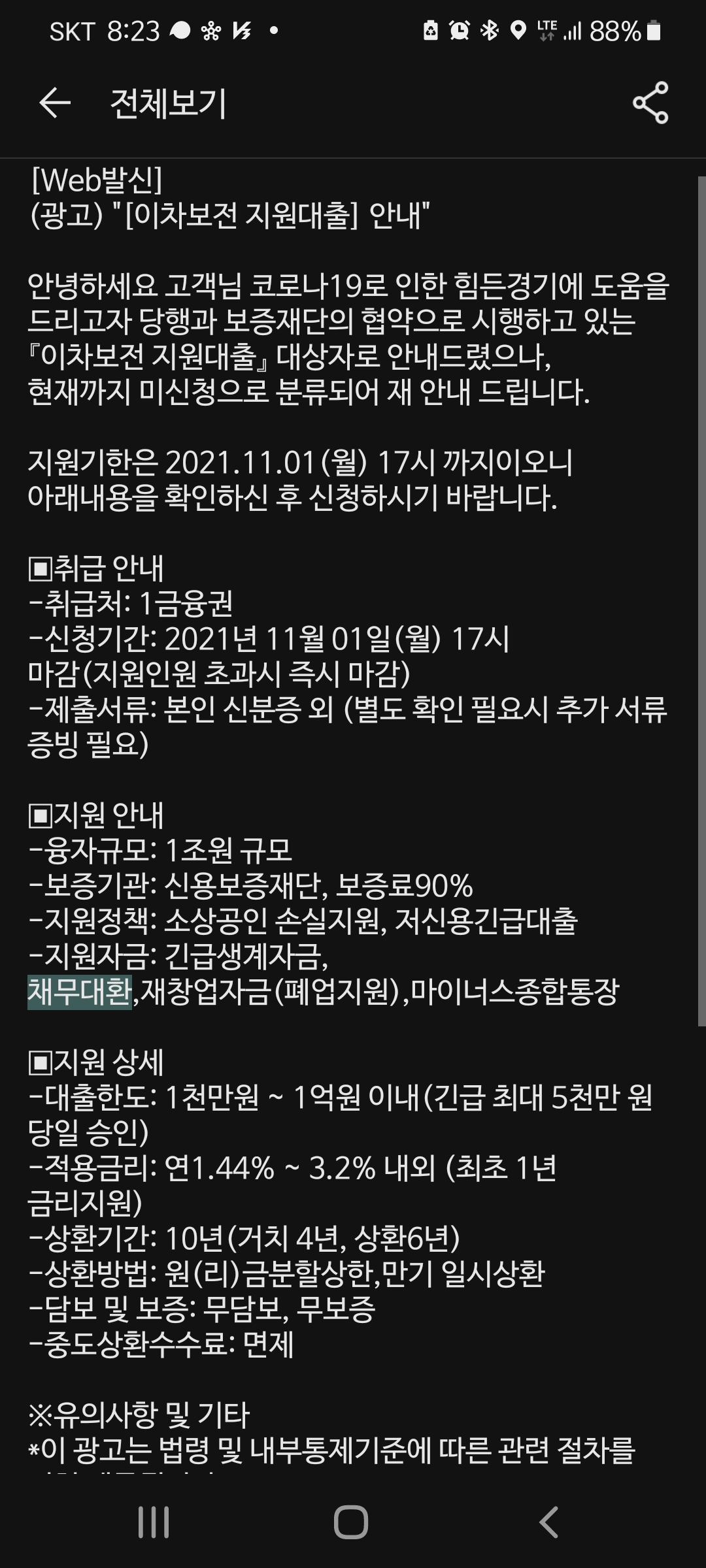 하지만 어떠한 은행에서도 불특정 다수를 대상으로 대출을 광고하거나, 이렇게 문자까지 보내며 대놓고 권하는 일은 절대로 없다고 합니다. 불특정 다수에게 얻어걸려라 식으로 보내는 문자이기에 지원의 대상도 두루뭉술하고 해당이 안되는 경우도 많습니다. 소상공인 손실지원, 재창업자금(폐업지원) 등의 내용은 사업체를 지금껏 한번도 운영해보지 않은 일반 직장인인 저의 경우 전혀 해당이 없습니다.