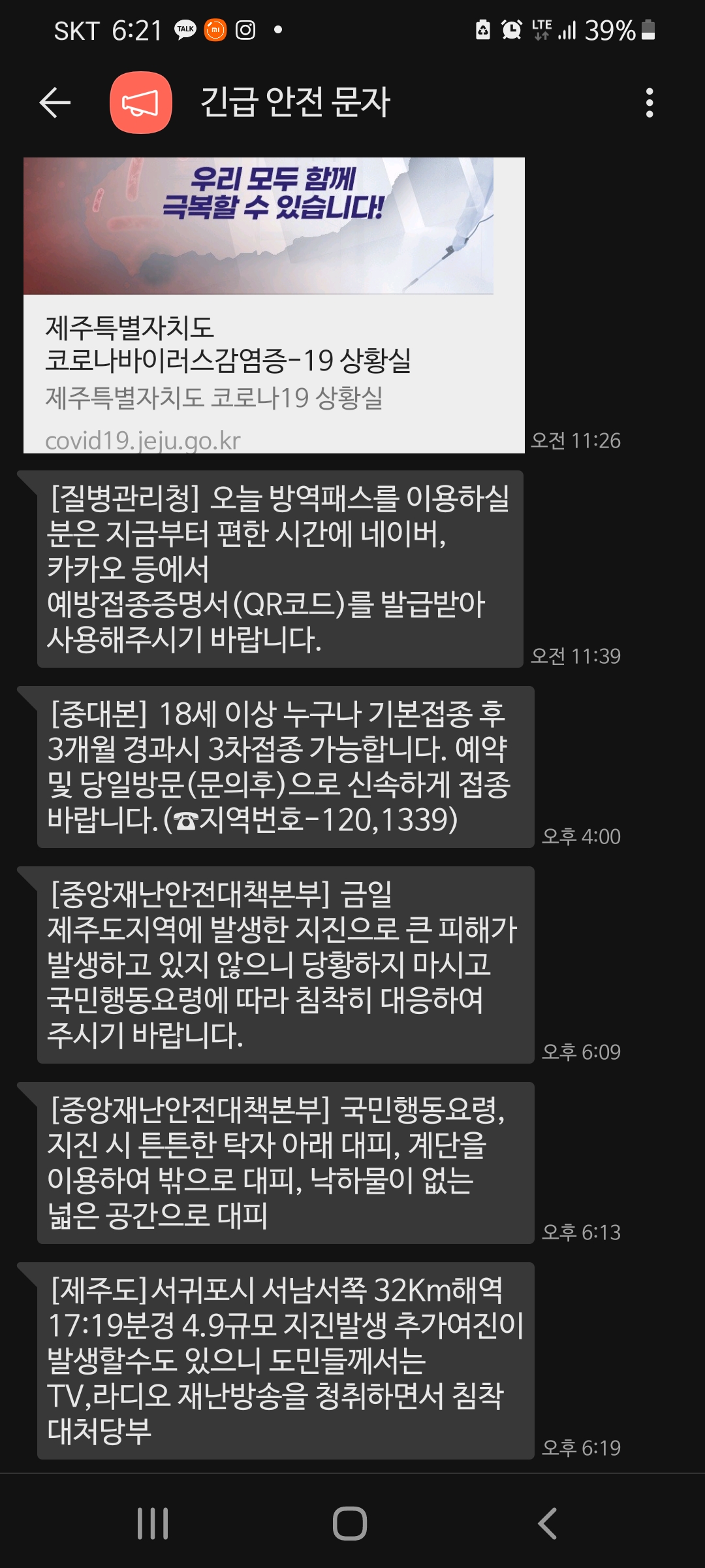 갑자기 찾아 온 지진에 우선 크게 놀라서 솔직히 제대로 대처를 할 생각도 못했던 것 같아요. 그 이후로 전국적으로 간 재난문자 덕분에 간만에 가족들과 많은 친구들의 안부 연락을 받게 되었습니다.