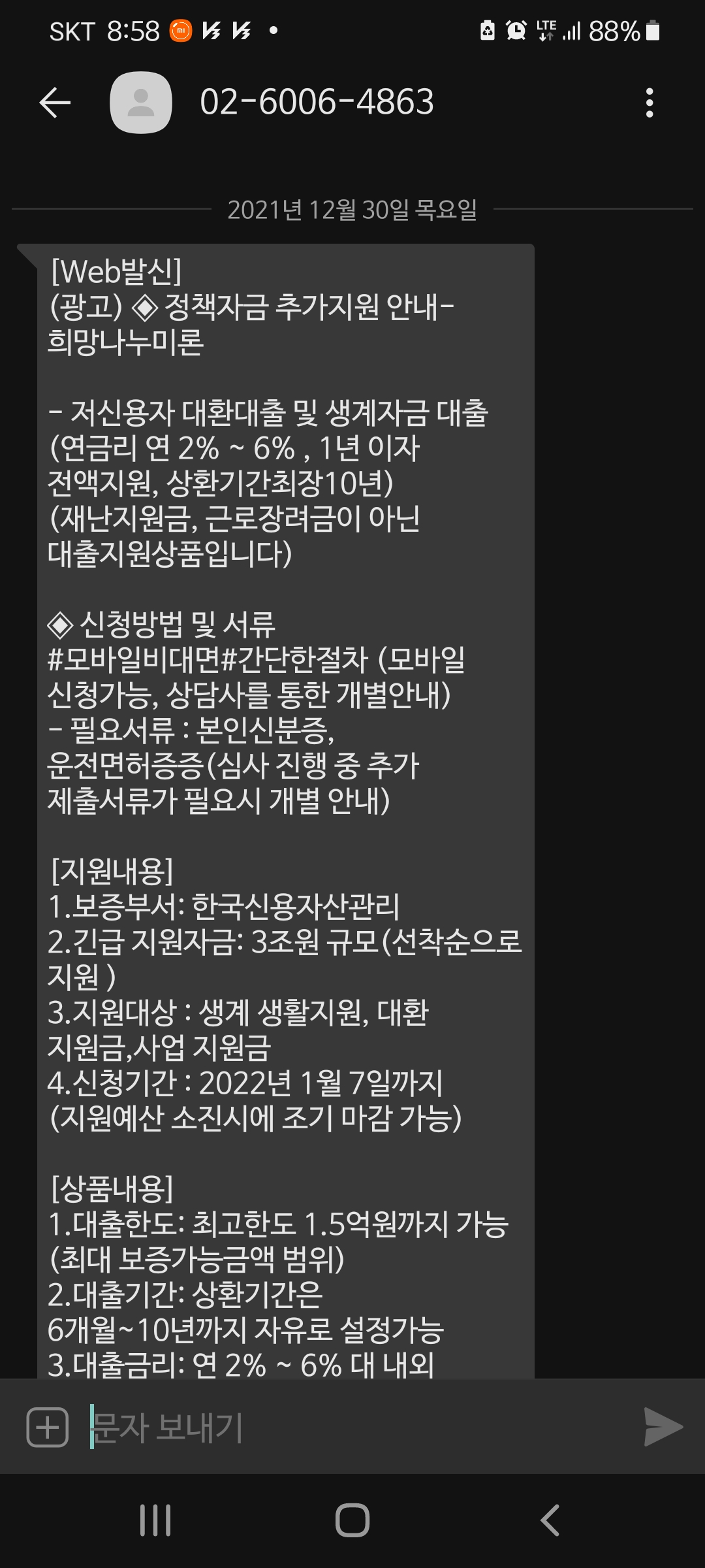| 『대출빙자 스팸문자』 긴급경영안정자금 (0) | 2022.01.10 |