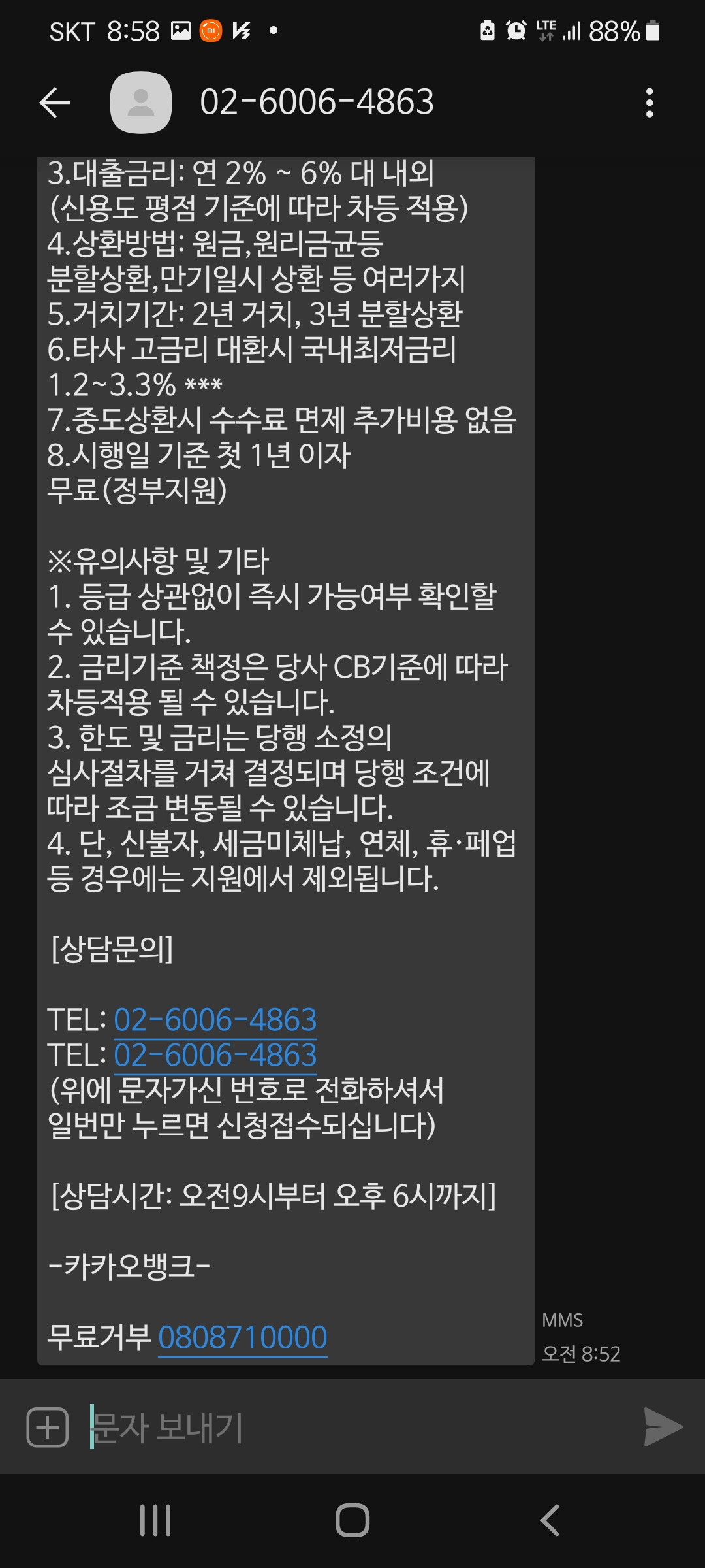 저의 경우 본가도 서울이 아니고, 현재 제주 중에 거주 중인데 서울 지역번호 02번으로 대출 관련 전화가 올 일이 뭐가 있을까 싶어요. 은행에서 대표번호가 아닌 다른 번호로 문자나 전화가 왔을 경우에는 무조건 의심을 해보시는 편이 좋습니다. 또 카카오뱅크인데 카카오톡이 아닌 문자로 대출을 광고한다는 것도 아이러니한 것 같아요.