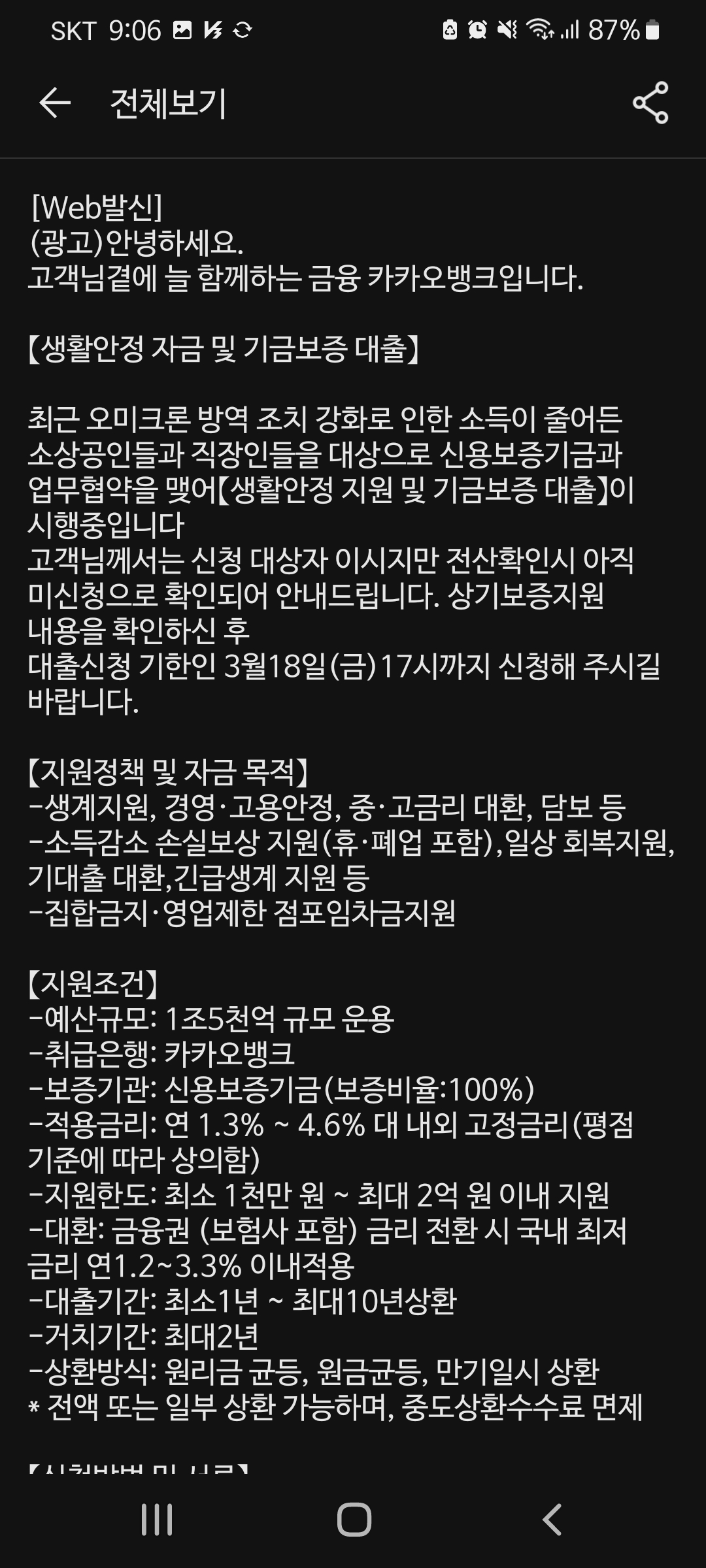 | 『지원금 사칭 스팸문자』 카카오뱅크 위기극복 다중채무 저금리 대환 및 특별지원 5차 긴급고용안정자금 (0) | 2022.03.24 |