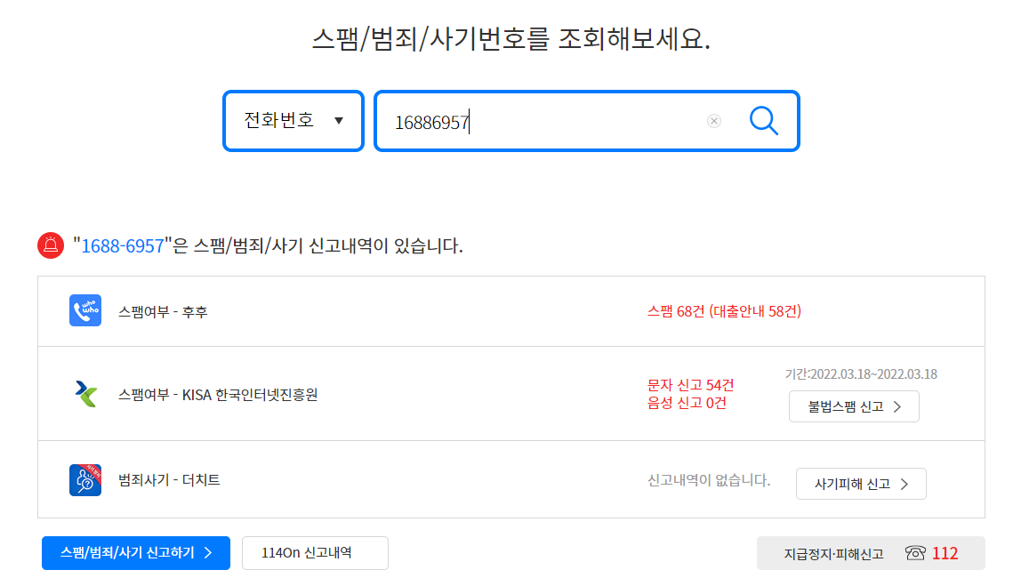 KT114에 문자에 안내된 상담번호 1688-6957을 조회해보니 대출안내 스팸번호로 68건이나 신고된 번호로 조회가 되는 것을 보실 수 있습니다.
