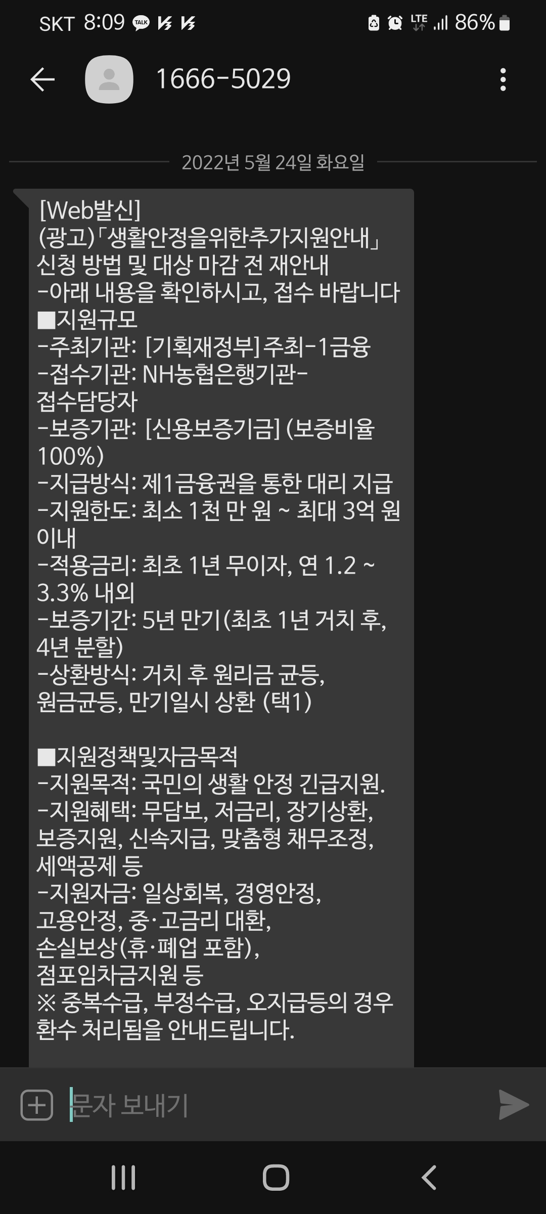 안녕하세요. 자유리뷰주의 리뷰럴입니다. 최근 은행 또는 정부 지원금을 사칭하며 대출을 해준다는 문자들이 기승을 부리고 있습니다. 한동안 잠잠하더니 오늘 또 NH농협은행의 생활안정을 위한 추가지원 안내라며 신청을 하라는 문자 한통을 받았는데요.
